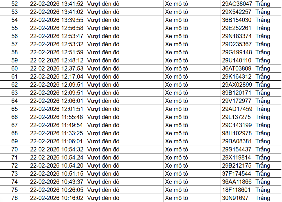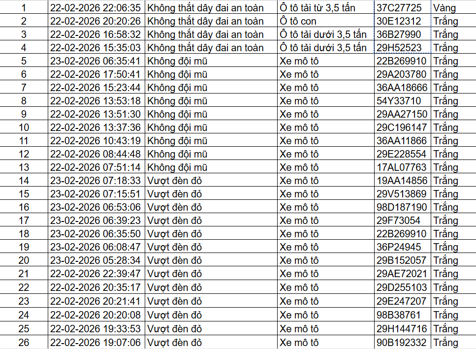 Ngày 23/2, Cục Cảnh sát Giao thông đã công khai danh sách 85 trường hợp xe mô tô, xe ô tô vi phạm trật tự, an toàn giao thông, được phát hiện qua hệ thống camera phạt nguội. Trong đó, lực lượng chức năng phát hiện 72 trường hợp vượt đèn đỏ, 9 trường hợp không đội mũ bảo hiểm và 4 trường hợp không thắt dây an toàn.