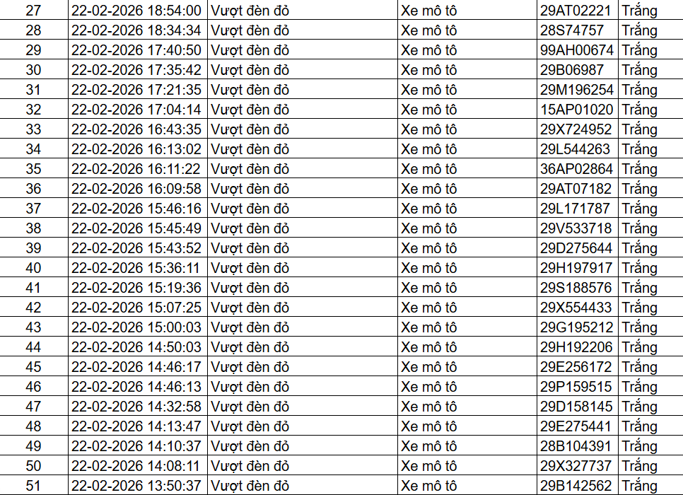 Danh sách được ghi nhận từ ngày 22/2 đến ngày 23/2, với lỗi vi phạm phổ biến là người điều khiển xe mô tô vượt đèn đỏ.