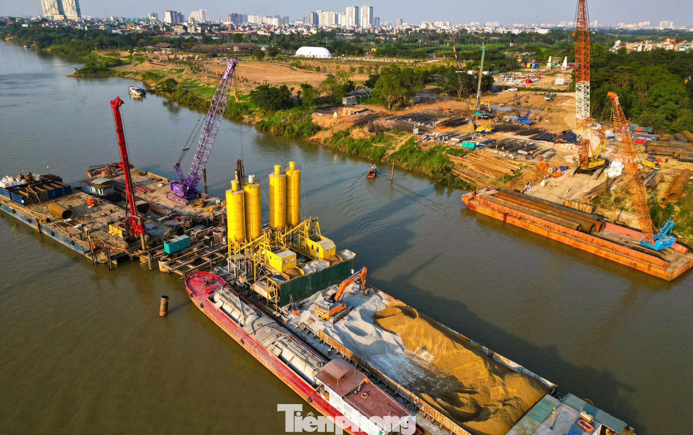 Các nhà thầu đang tích cực triển khai nhân lực, máy móc để chuẩn bị thực hiện các hạng mục như dầm, khoan cọc nhồi ở các trụ giữa sông.